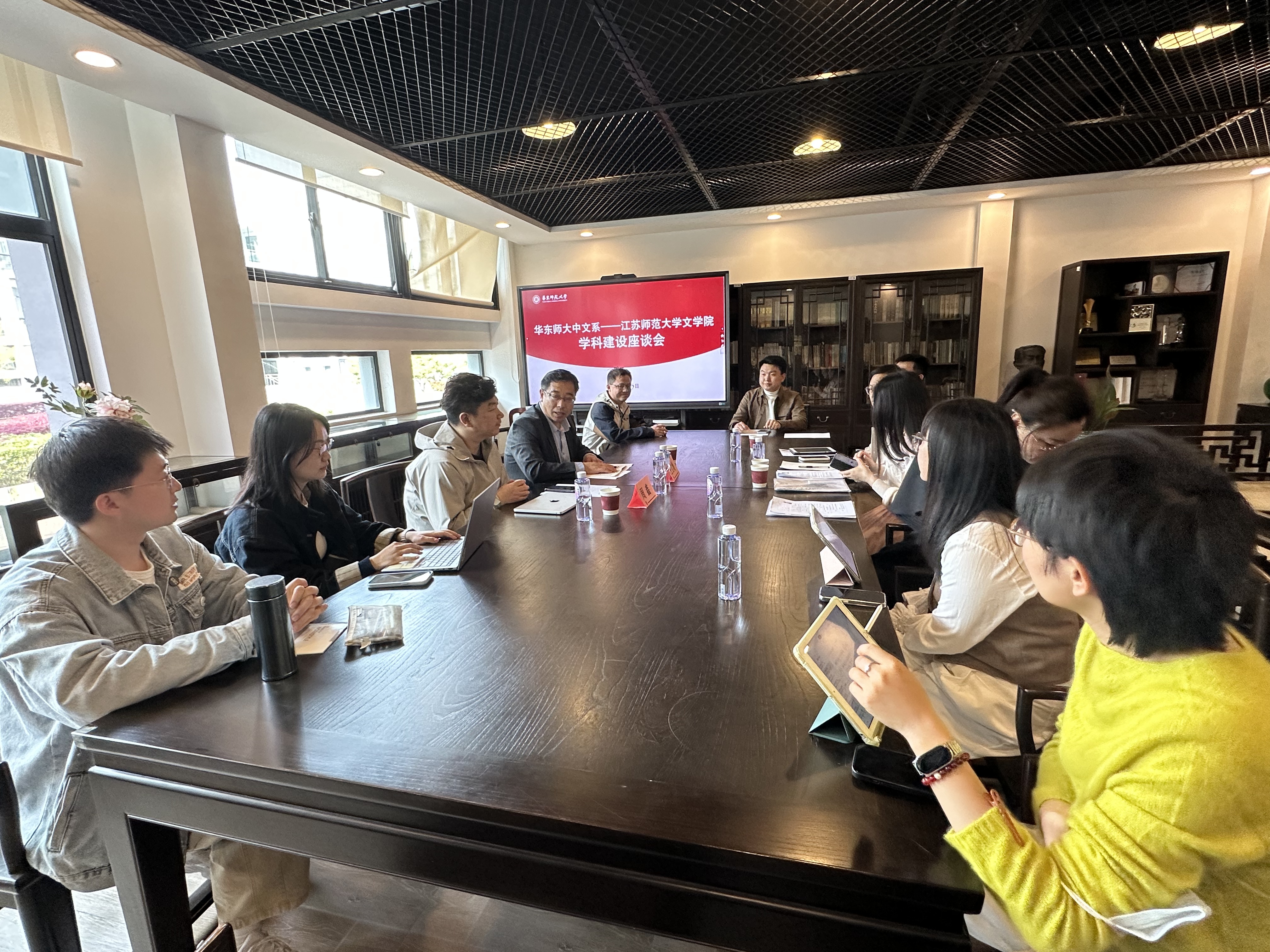 座谈会上,系主任罗岗教授、党委书记徐默凡教授对王立增院长一行表示热烈欢迎,全面介绍了ag官网 的学科底蕴、师资力量、人才培养等方面建设成果。王立增院长介绍了江苏师大文学院的发展概况、学科布局与人才需求,表达了加强院际交流合作的期待。围绕“十五五”规划编制、学科优化与“双一流”建设、师资队伍建设等核心议题,双方分享顶层设计思路与实践经验;面对人工智能发展新趋势,双方重点交流数字人文交叉领域的探索实践,共商人文学科转型与核心价值坚守的融合之道。双方还就博士生“申请-考核制”、培养方案优化、导师队伍建设等话题务实研讨,并就毕业生多元就业引导达成共识。