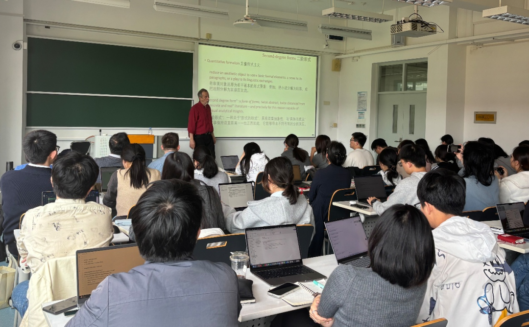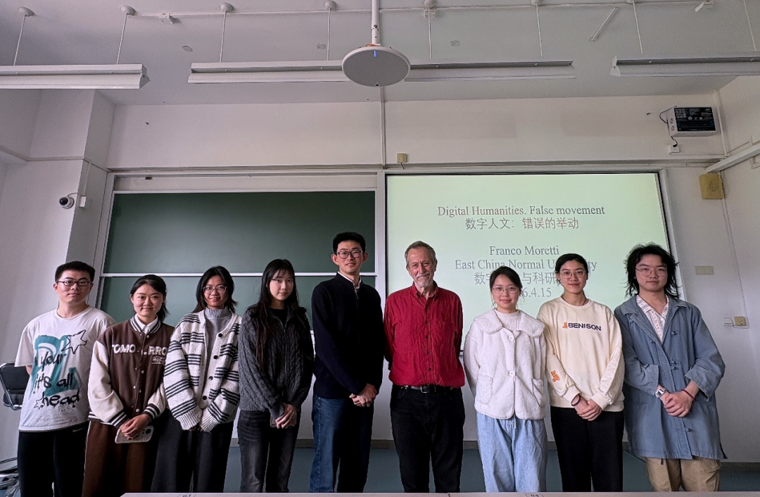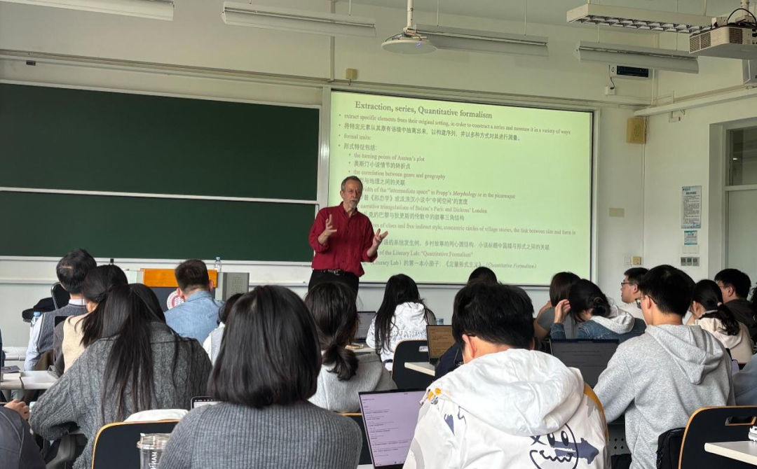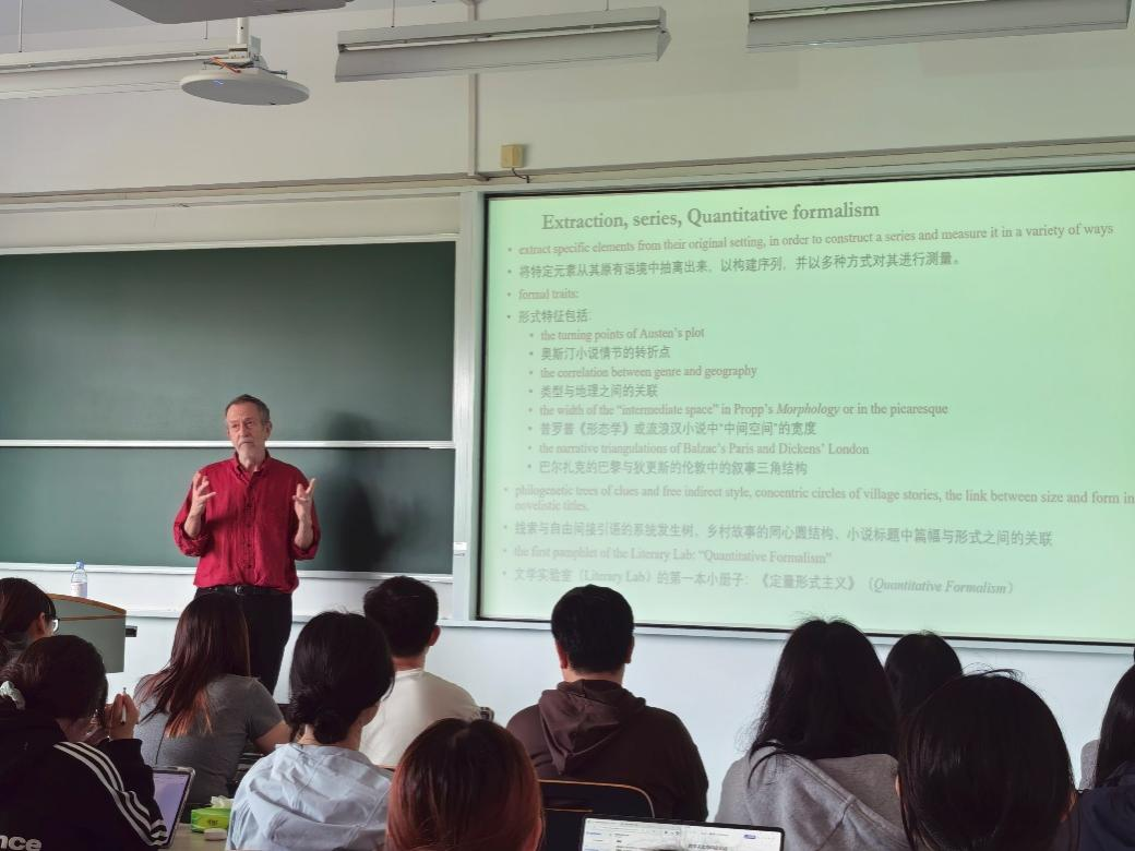 2026年4月15日下午,华东师范大学荣誉教授、斯坦福大学荣休讲席教授弗兰科·莫雷蒂(Franco Moretti)应邀为ag官网-ag娱乐城-亚游ag 学生开展“Digital Humanities False movement”主题讲座。本次讲座是“元化班”课程“数字人文与科研实训”的核心环节,讲座由ag官网 文艺学教研室山谷副教授主持,ag官网 副系主任王嘉军教授、文艺学教研室吴娱玉教授等参与研讨,现场气氛热烈。